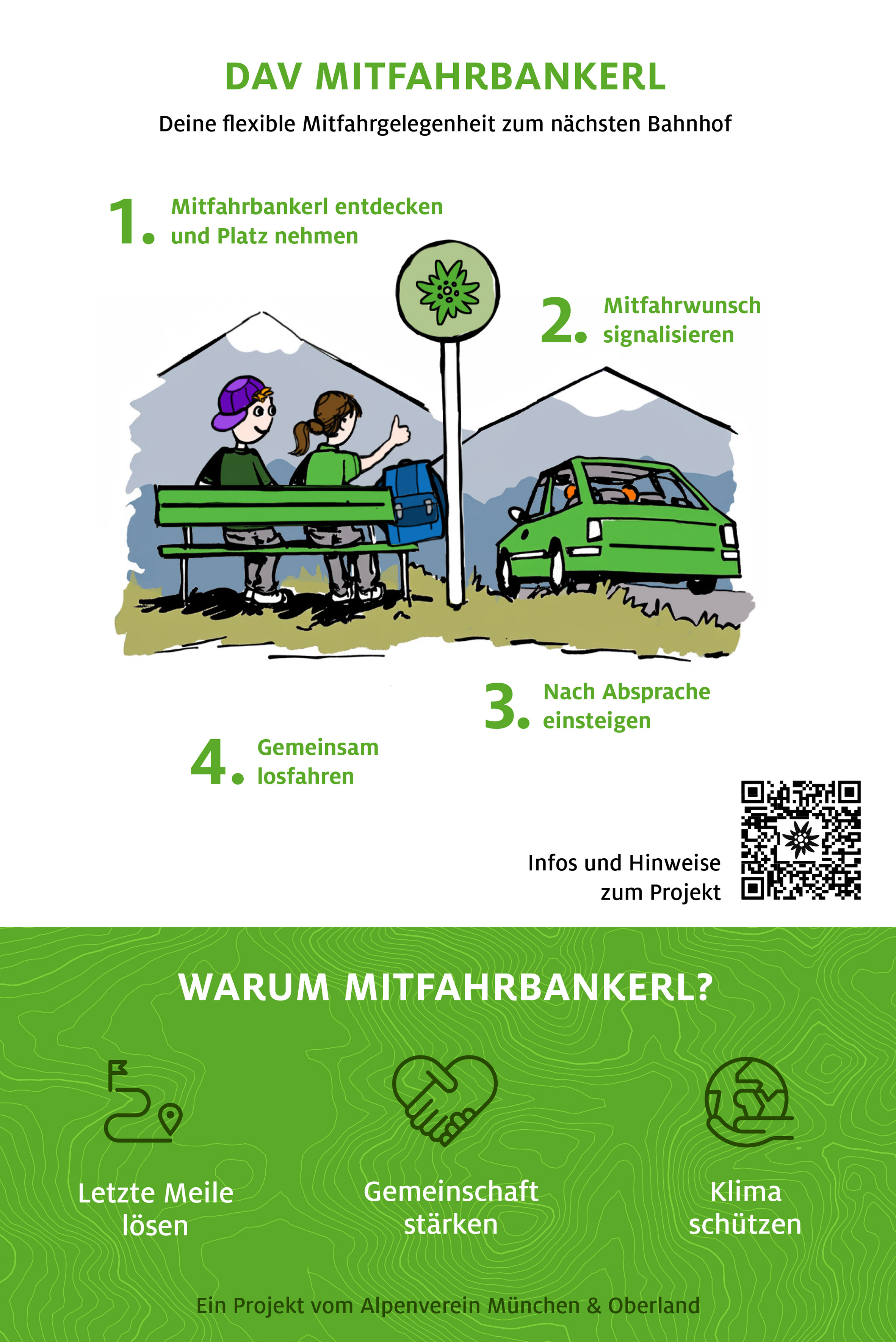 Spontan mitfahren statt Warten: Zwei DAV-Mitfahrbankerl jetzt auch am Samerberg Wer kennt das nicht? Du kommst von einer Hochriestour in der Spatenau an, und jetzt heißt es den langen Weg zum Auto an der Talstation antreten. Damit ist jetzt Schluss! Das Mobilitätsprojekt des Alpenvereins München & Oberland, das im Sommer 2025 gestartet ist, bringt sein cleveres Mitfahr-Angebot nun auch zu uns auf den Samerberg. Ein Bankerl wartet auf dich an der Talstation der Hochriesbahn in Grainbach....... ..... und ein Bankerl am Wanderparkplatz Spatenau Du kannst gemütlich deine Wandertour zur Rundtour erweitern - und so geht's: Nach deiner Tour setzt du dich einfach auf das DAV-Bankerl. Vorbeikommende Wanderer mit freien Plätzen im Auto erkennen dein Signal, ihr kommt ins Gespräch und schon kann's losgehen. Die Bankerl sind nicht nur praktisch für die letzten Meter zu deinem Auto, sondern auch eine tolle Alternative, wenn die Parkplätze zu Stoßzeiten hoffnungslos überfüllt sind. Deine Sicherheit steht dabei natürlich an erster Stelle: Steig nur ein, wenn du dich wohlfühlst, und nutze bei Bedarf ein Trackingtool, um deinen Standort zu teilen. So findest du die Bankerl: Der Alpenverein München & Oberland hat alle Standorte digital für dich aufbereitet. Du findest sie in bekannten Touren- und Mobilitätsplattformen wie Google Maps, Outdooractive, alpenvereinaktiv und sogar in der MVV-App als Haltestelle oder Point of Interest. Hier gibt es eine übersichtliche Karte mit allen Bankerl-Standorten vom DAV - Sektion Oberland. Und wenn du dir das Ganze noch besser vorstellen möchtest, schau dir das kurze YouTube Video an, das die Idee erklärt: